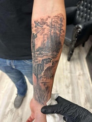 Owner and Artist of Viridian Ink. She’s been tattooing since 2010. She has a love for nature and animals. She’s been drawing since she could pick up a crayon. She loves both color and black and grey tattooing. She’s licensed in all paramedical tattooing since 2015. After school she did a two year apprenticeship were found her passion in Tattooing. In 2023 she became part of Ink Defense Pro-team. She enjoys traveling with them and loves what their product has to offer. She specializes in all things Nature. She loves animal portraits of both your beloved pet as well as wildlife. Anything PNW with plants, trees, skulls, mushrooms and critters. She’s tapping into the cottage-core style and would love to explore more surrealism. She also loves doing cartoon characters especially Disney. On her off time she loves gardening, hiking, biking and yoga. Her favorite colors are viridian green, deep burgundy and black. She has her own mini farm with dogs, cats, bunnies chickens, quail and fish! She has a wonderful family that is her world and her drive. She enjoys art, photography, reading, listening to true crime podcasts and love spooky season.